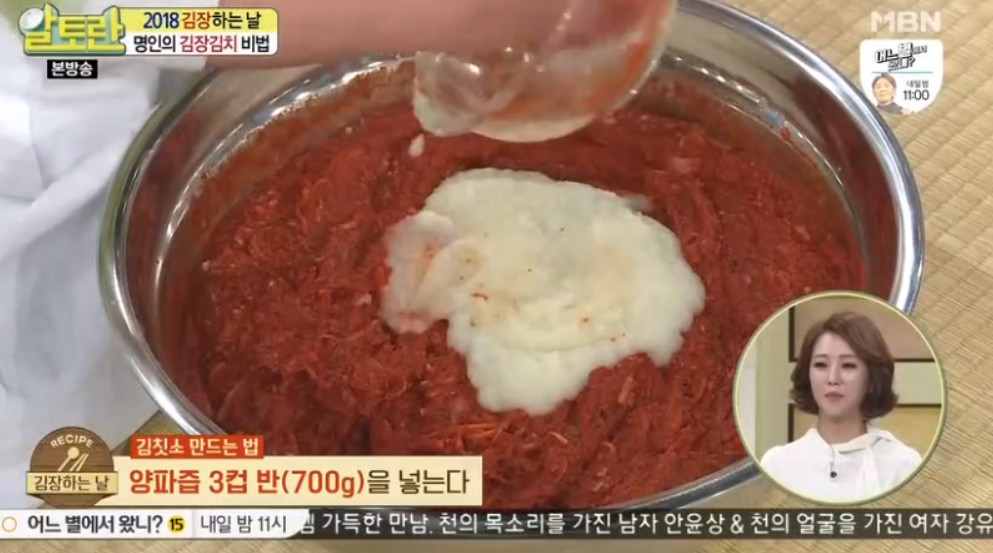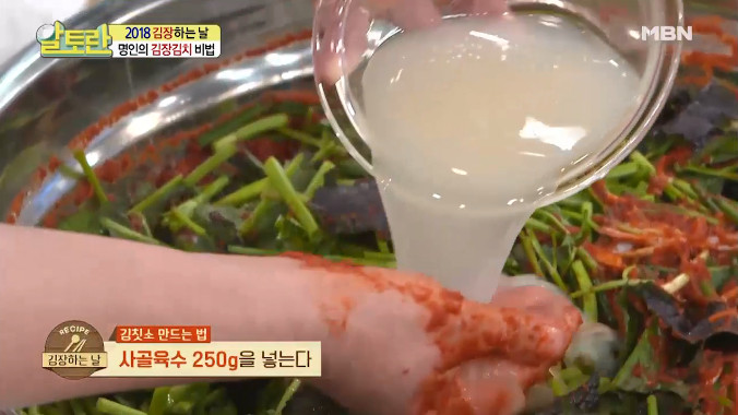 ※ 여기서 김치 명인의 비법이 있습니다. 모든 재료를 혼합한 김치소에 마지막으로 사골육수 250g을 추가하는 것이 비결이라고 합니다. 사골육수는 시중에서 판매되는 제품을 사용해도 괜찮다고 하네요.