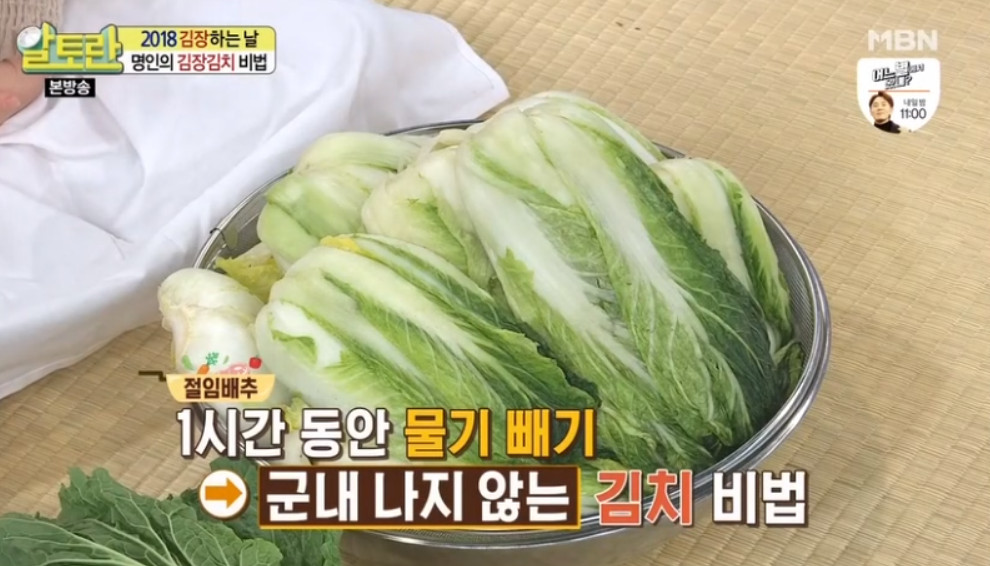 배추 절임이 완료된 후에는 약 1시간 동안 물기를 빼는 작업이 필요합니다. 이렇게 해야 배추에서 군내가 발생하지 않는다고 합니다.