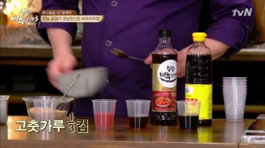 1. 국간장 1/3컵, 액젓 1/3컵, 고춧가루 1/3컵 (국간장 : 액젓 : 고춧가루 = 1 : 1 : 1 비율)