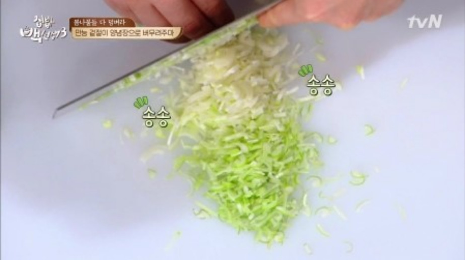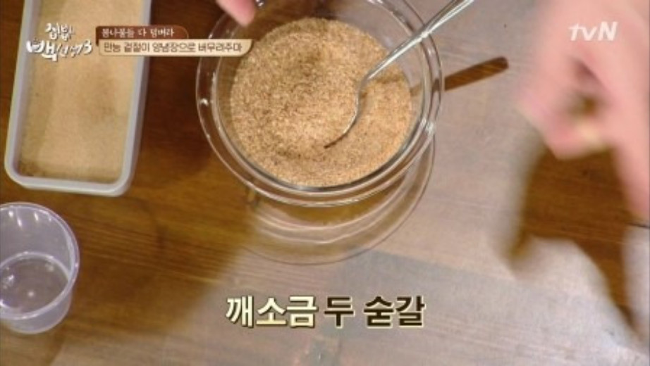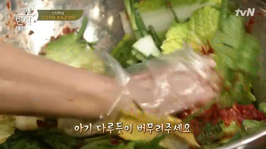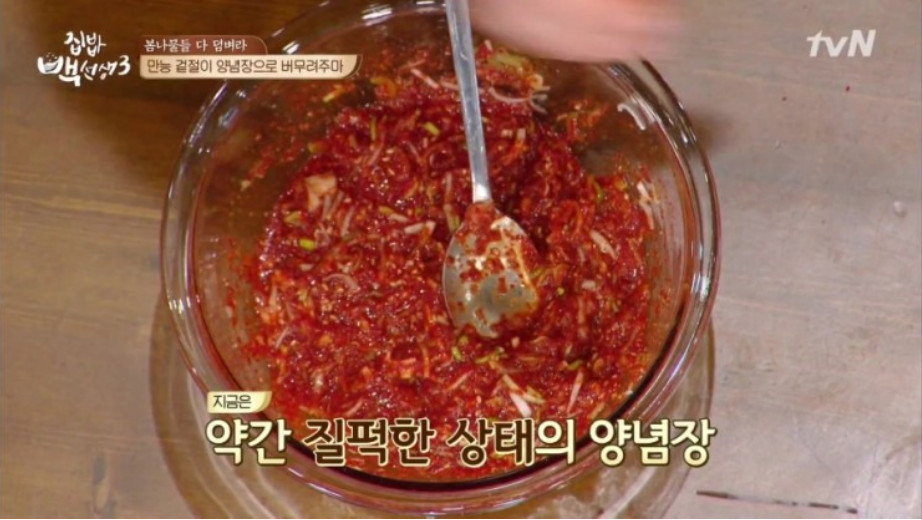 4. 참고로 봄동 겉절이는 소금에 절이지 않는다는 점을 기억하세요. 마지막으로 통깨를 충분히 뿌리면 김수미의 황금 레시피에 따라 봄동 겉절이와 무침 양념장이 완성됩니다.