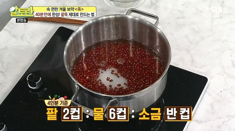 팥은 불리지 않고 바로 2컵을 넣습니다. 여기에 물 6컵과 굵은 소금 ½컵을 추가하는데, 이때 맛소금이 아닌 굵은 소금을 사용하는 것이 좋습니다. 4인분 기준으로 물 1컵당 소금 1 큰술의 비율로 조절하면 됩니다.