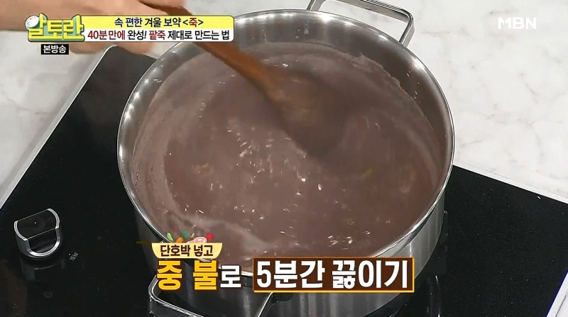 이렇게 10분간 첫 번째 삶기를 진행합니다. 동지 팥죽 만드는 법의 핵심은 소금을 잘 녹이기 위해 휘휘 저어 주고, 뚜껑을 열어 떪은 맛이 충분히 제거되도록 하는 것입니다. 반드시 뚜껑을 열고 삶아야 한다는 점을 기억해 주세요. 조리 과정에서 튀는 경우가 많기 때문에 깊은 냄비를 사용하는 것이 훨씬 편리하다고 합니다.