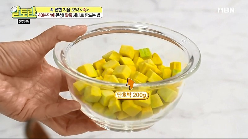 8. 동지 팥죽 만드는 법의 네 번째 포인트는 설탕 대신 자연의 단맛을 제공하는 단호박을 사용하는 것입니다. 늙은 호박도 좋지만, 작게 깍둑썰기 한 단호박 200g을 넣어주세요. 설탕을 넣으면 사포닌 성분이 파괴되어 궁합이 좋지 않다고 합니다. 단호박은 3-5분 만에 익으니 중불에서 약 5분 정도 끓여주면 됩니다.