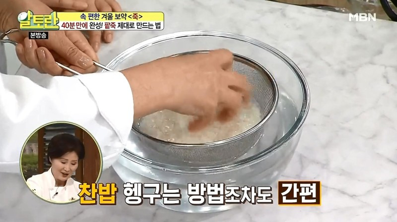 7. 세 번째 포인트는 쌀 대신 찬밥을 사용하여 시간을 단축하는 것입니다. 일반 밥을 넣으면 뭉쳐서 일일이 풀어줘야 하는 번거로움이 생기기 때문에, 찬밥을 찬물에 헹궈서 사용하는 것이 핵심입니다!