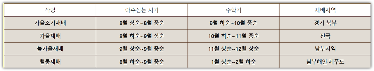 ▶파종 시기: 남부지방에서는 8월 중순, 중부지방에서는 8월 상순에 파종합니다.